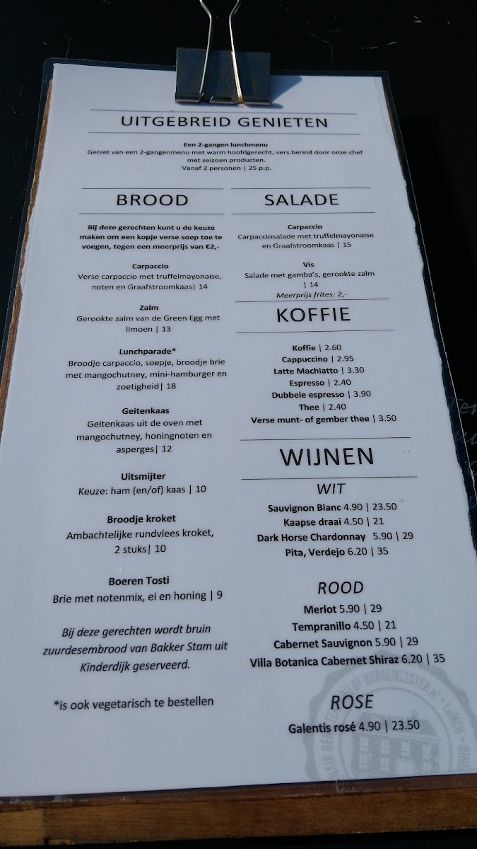 The menu at De Burgemeester offers a delightful mix of classic Dutch flavors and modern twists. A standout is the Carpaccio, a tender and flavorful dish that perfectly sets the tone for a satisfying meal. The Salade Van Schaaldieren combines fresh seafood with a light dressing, making it an ideal choice for those craving something both refreshing and indulgent. For a heartier option, the Uitsmijter Ham-kaas delivers a comforting plate of eggs, ham, and cheese, a simple yet satisfying favorite. Vegetarians will appreciate the Veganistische Salade, a vibrant and wholesome salad packed with fresh ingredients and satisfying textures. To complement the meal, try the refreshing Ijsthee, a cool and thirst-quenching iced tea that rounds off the dining experience. With a range of dishes that cater to various tastes, De Burgemeester provides a menu that is both diverse and consistently delicious.